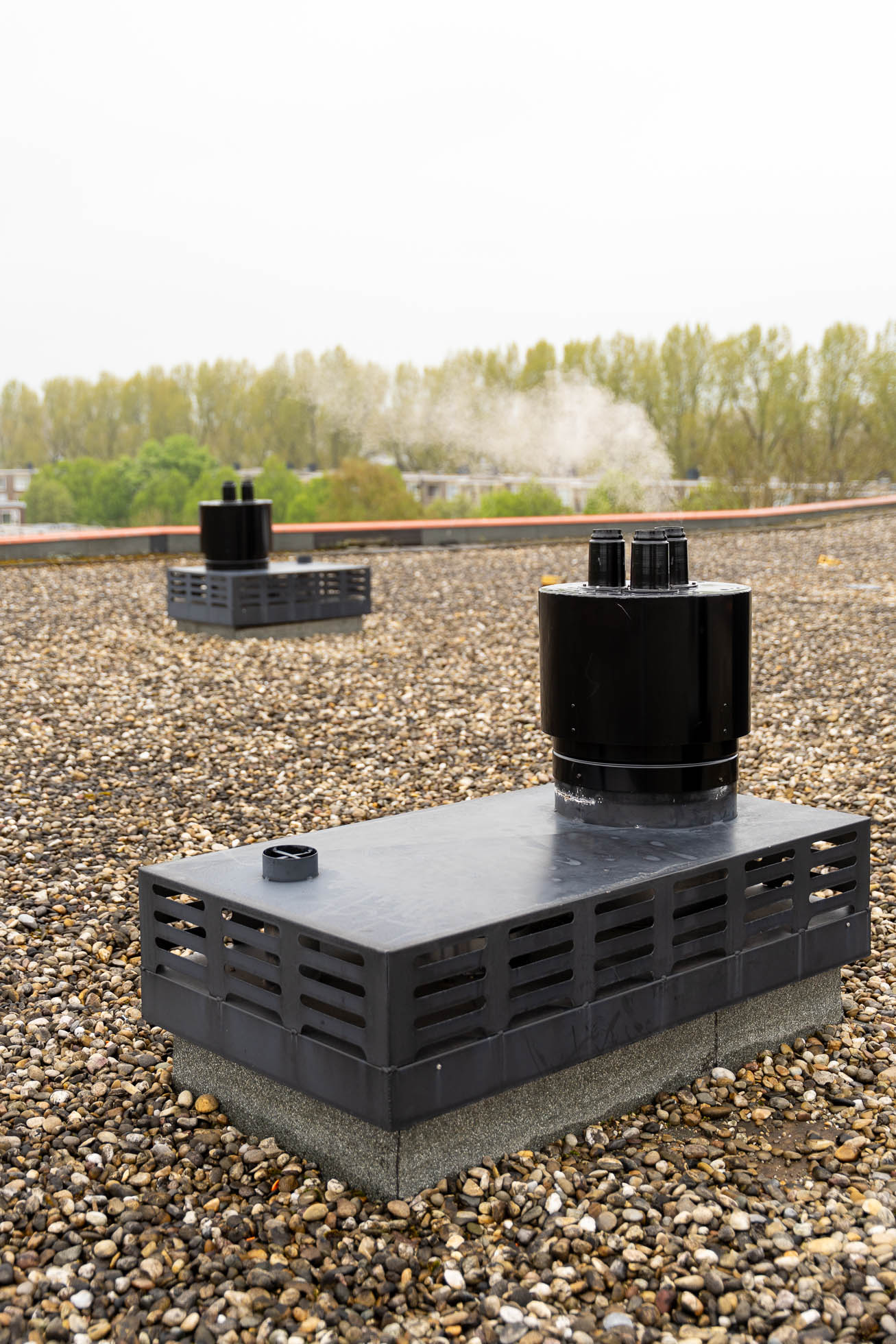 Individueel: Meestal de beste keuze voor gebouwen tot 3 of 4 woonlagen. Elk appartement heeft zijn eigen afvoer naar het dak of de gevel.